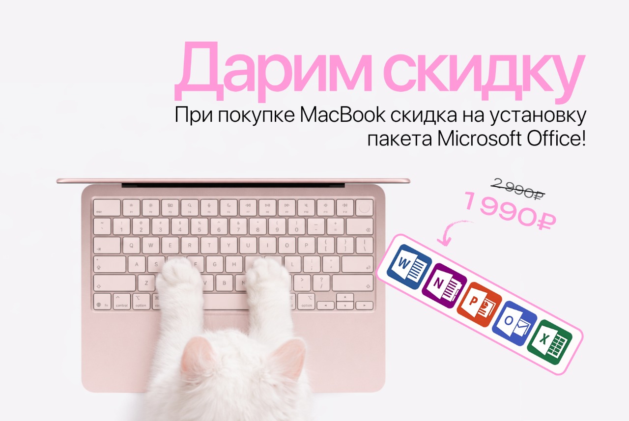 При покупке MacBook Air 13 M5, MacBook Air 15 M5, MacBook Pro 14 M5 или MacBook Neo вы можете установить пакет Microsoft Office по специальной цене — всего 1 990 ₽ вместо 2 990 ₽.